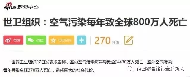 世界衛生組織2015年公告也顯示,全世界每年有800萬人死于空氣污染。